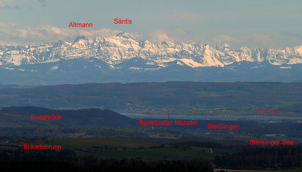 Der Säntis liegt südlich vom Witthoh etwa 85 Kilometer Luftlinie entfernt. Dabei erkennen Sie mit Glück sogar mit dem bloßen Auge, dass auf dem Gipfel eine Bergstation und ein Mast steht. Mit einem